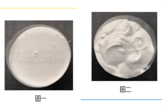 由于(攪拌或搖動)其粘度即降低的流動性質,稱為觸變性??梢酝ㄟ^粉體表面改性提高涂料體系的觸變值。由于有觸變特性,當涂刷較厚時不會出現(xiàn)流掛現(xiàn)象,同時有儲存穩(wěn)定性好等優(yōu)點。(以下為改性前后的數(shù)據(jù)對比,圖一為1250目重鈣,圖二為DXC系列改性粉體)
