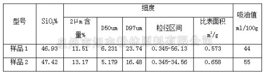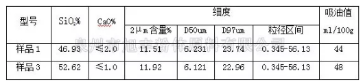 滑石粉中的二氧化硅(SiO2)含量也是影響其吸油值的主要因素之一,選取樣品1和樣品3兩款相同細度,不同硅含量的滑石產(chǎn)品,進行檢測對比,由下表的檢測數(shù)據(jù)可知:原礦二氧化硅含量越高,碳酸鈣等雜質(zhì)含量越低,吸油值越高。