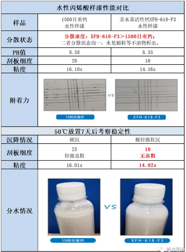 對(duì)比可知:親水基活性鈣XFH-618-F3比普通1500目重鈣潤(rùn)濕速度快、分散效果好,附著力及儲(chǔ)存穩(wěn)定性提高。更多應(yīng)用信息或獲取樣品請(qǐng)來(lái)電咨詢(xún),旭豐粉體竭誠(chéng)為您服務(wù)!